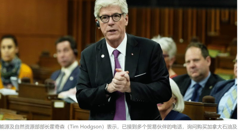 能源及自然资源部部长霍奇森(Tim Hodgson)表示,已接到多个贸易伙伴的电话,询问购买加拿大石油及液化天然气的详情。